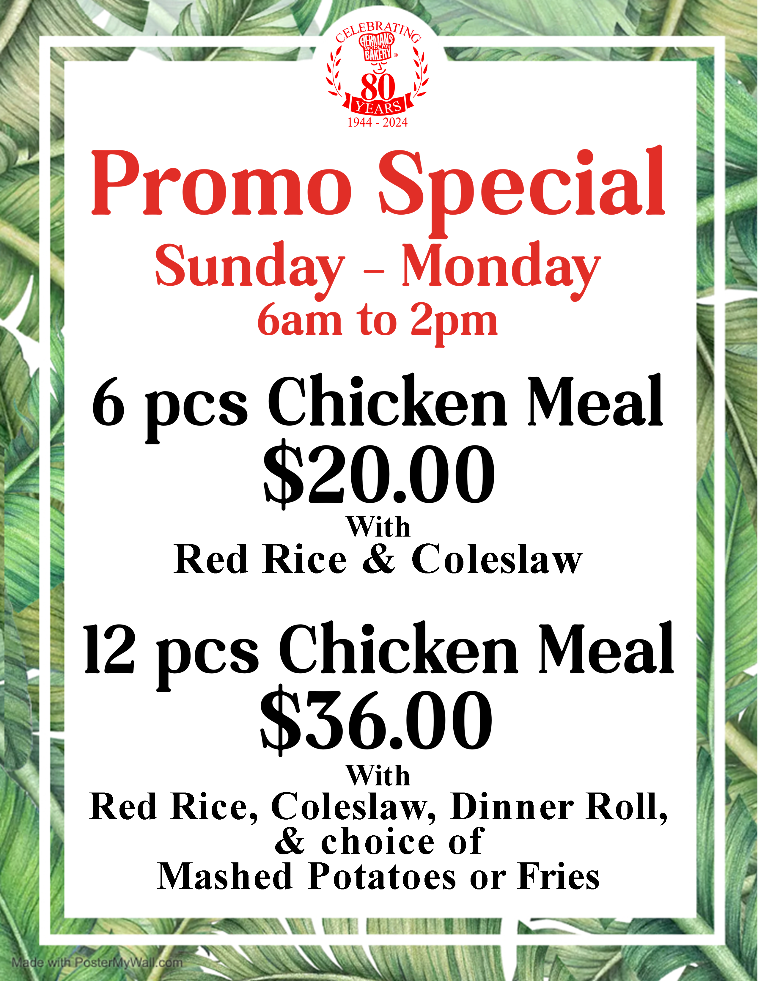 12 pcs Chicken Meal w/ Red Rice, Coleslaw, Dinner Roll, & choice of Mashed Potatoes or Fries – $36.00